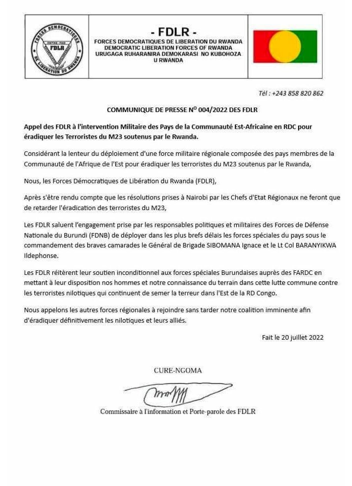 Itangazo ry’umutwe wa FDLR ryo kuwa 20 Nyakanga 2022, ryashyizweho umukono n’umuvugizi wa FDLR, Maj Cure Ngoma, rivuga ko FDLR itewe impungenge ndetse ko yamaze kubona ko Umuryango w’Ibihugu by’Uburasirazuba bwa Afurika EAC, urimo gutinza gahunda yo kohereza umutwe w’ingabo uhuriwe n’Ibihugu bigize uyu muryango mu rwego rwo gurwanya M23 n’indi mitwe y’inyeshyamba yitwaje intwaro mu Burasirazuba bwa DR Congo.