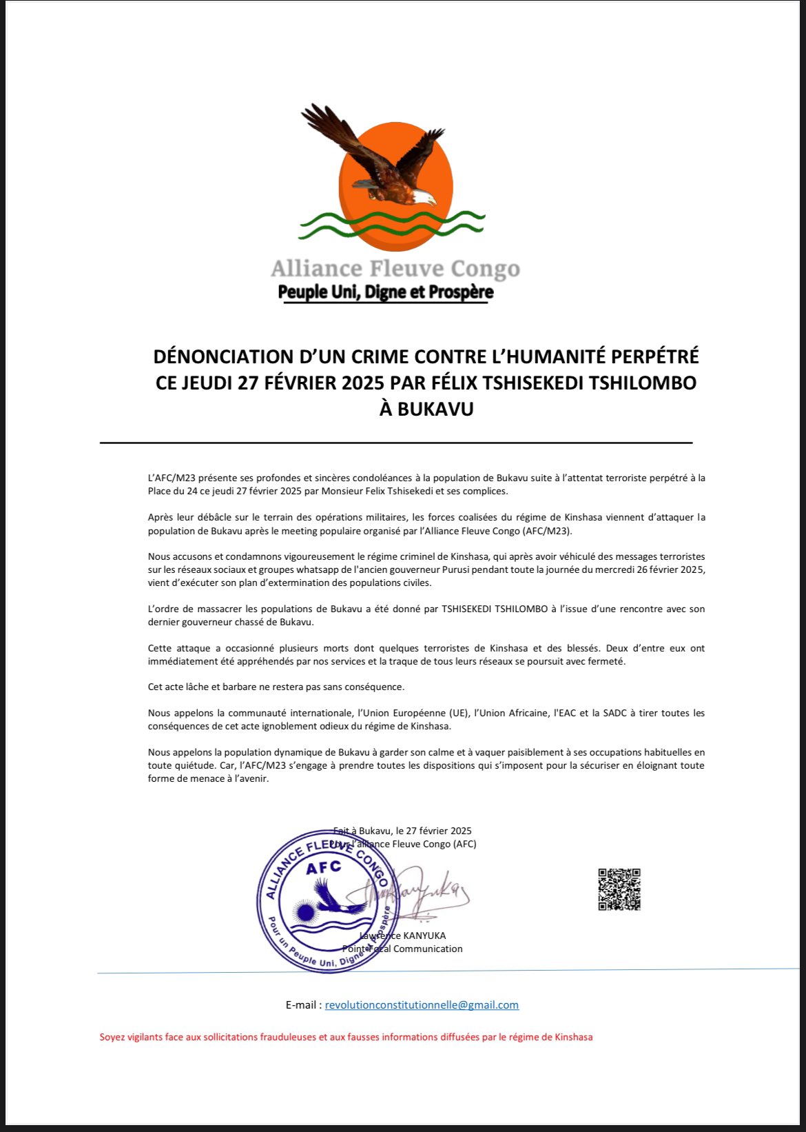 Ihuriro AFC / M23 ryihanganishije abaturage b’i Bukavu nyuma y’igitero cyiswe icy’iterabwoba cyagabwe ku mbaga yari iteraniye mu biganiro byahuje abaturage n’ubuyobozi bwa AFC/M23.