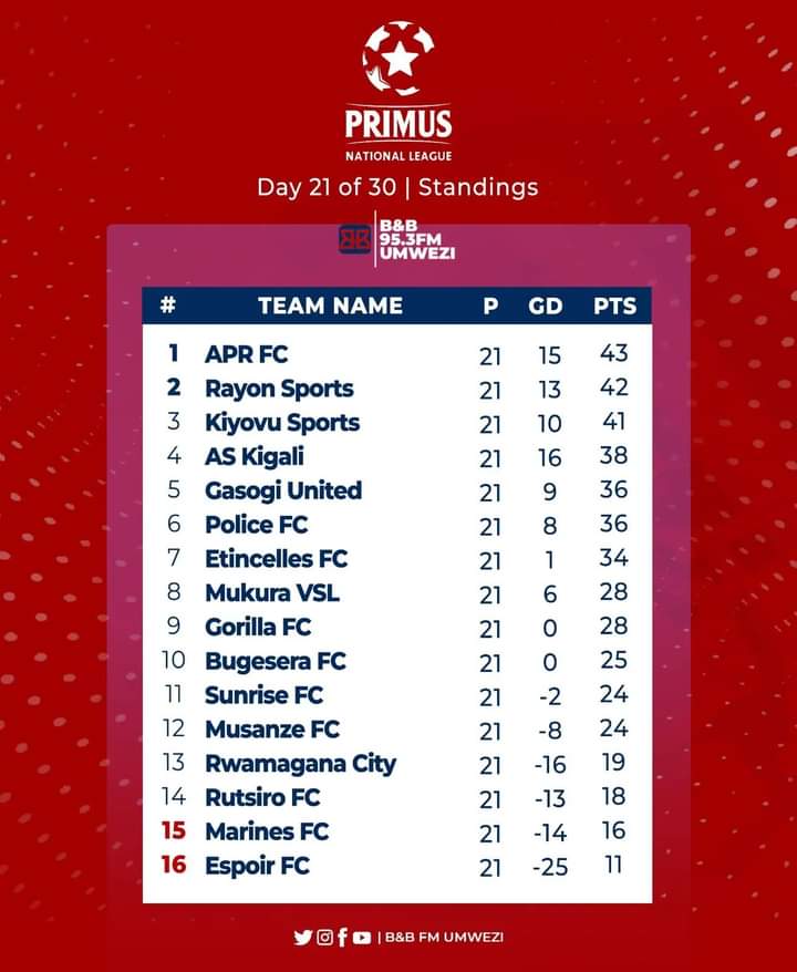 Urutonde rw’amakipe yose uko akurikirana nyuma y’umunsi wa 21.