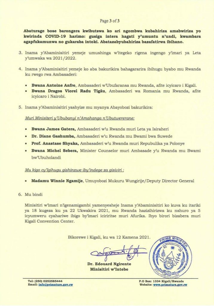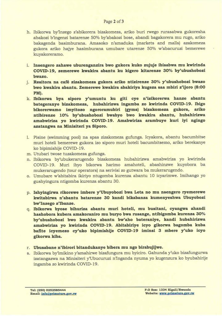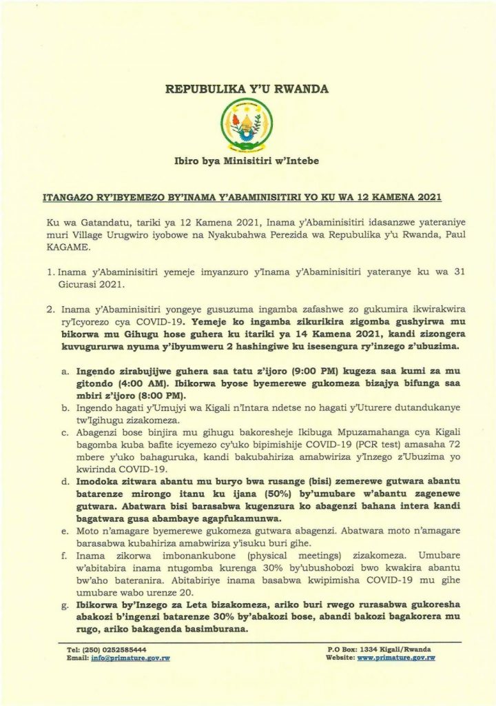 Aya mabwiriza kandi azatangira gushyirwa mu bikorwa tariki ya 14 Kamena 2021, akazongera kuvugururwa nyuma y’ibyumweru bibiri hashingiwe ku byemezo by’inzego z’ubuzima.