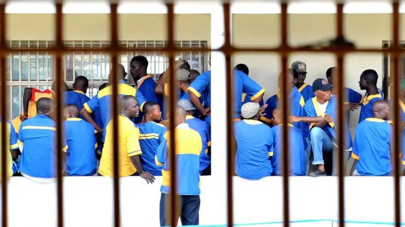 Ifoto yo mu bubiko (archive) igaragaza imfungwa zicaye ziganira muri gereza nkuru ya Makala.