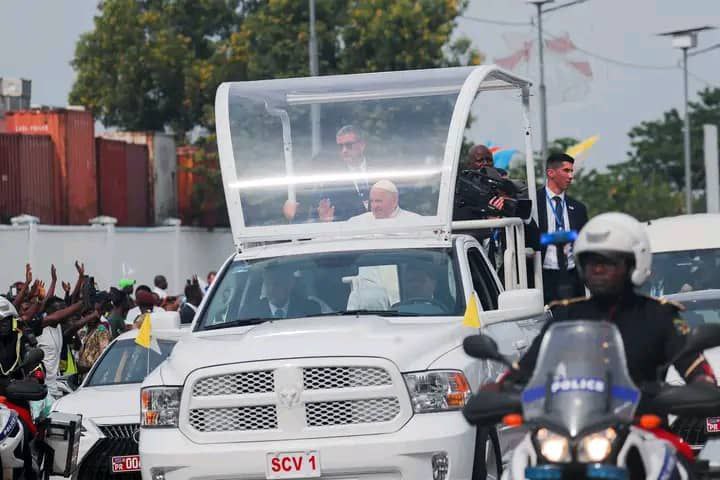 Papa Fransisko w’imyaka 85, amaze iminsi afite uburwayi bwo mu mavi, ibyatumye ubwo yari amaze kururutswa mu ndege bamushyira mu kagare k’abafite ubumuga. Yakiriwe ku kibuga cy’indege na ministiri w’Intebe Jean-Michel Sama Lukonde.