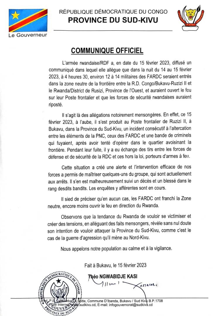 Iri tangazo ryashyizweho umukono na Guverineri w’iyi Ntara, Theo Ngwabidje Kasi, rivuga ko icyabaye mu gitondo cyo kuri uyu wa Gatatu tariki 15 Gashyantare 2023 ari ukurasana kwa Polisi n’ingabo (bya DR Congo) n’umutwe w’abagizi ba nabi bariho bahunga nyuma yo kugerageza gukorera muri quartier yegereye umupaka.