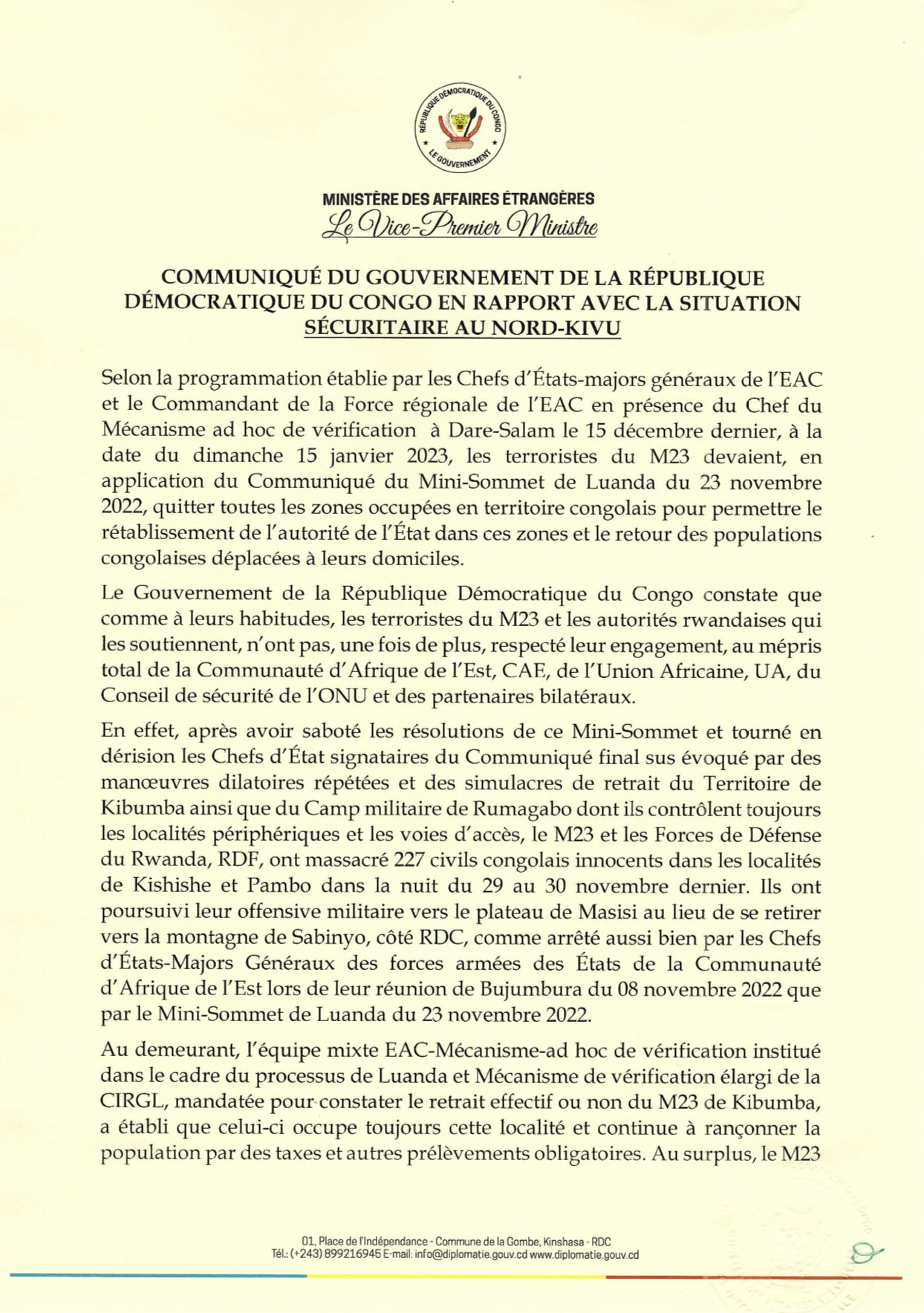 Ibi ni ibikubiye mu itangazo ryasohowe na Leta ya DR Congo, kuri uyu wa 18 Mutarama 2023, rishyirwaho umukono na Christophe Lutundula, Minisitiri w’Ububanyi n’Amahanga w’iki Gihugu, rivuga ko Umutwe wa M23 wakomeje kwinangira kuva mu bice wigaruriye muri Teritwari ya Rutshuru na Nyiragongo nk’uko ubisabwa n’imyanzuro ya Luanda na Naïrobi.
