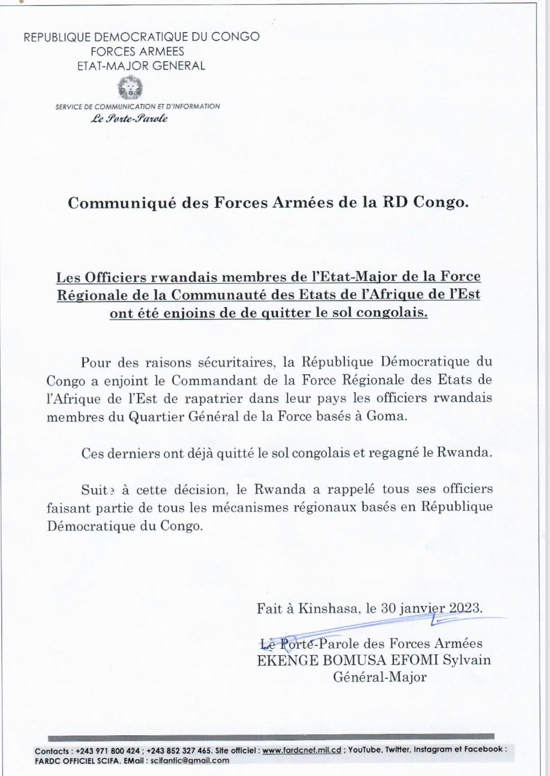 Itangazo ryashyizweho umukono n’Umuvugizi w’Ingabo za Congo, Gen Maj Ekenge Bomusa Efomi Sylvain, rivuga ko kubera impamvu z’umutekano, hafashwe umwanzuro “wo gukura mu Gihugu Abasirikare b’u Rwanda bari mu buyobozi Bukuru bw’Ingabo [za EAC] bufite icyicaro i Goma”.