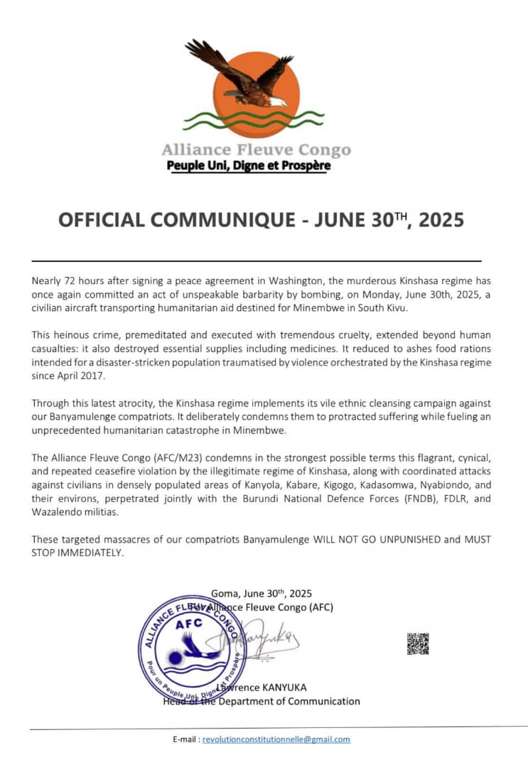 AFC/M23 na Twirwaneho basohoye itangazo bashinja ingabo za Leta ya DR Congo, FARDC kurasa ku ndege ya gisivile i Minembwe mu ntara ya Kivu y’Amajyepfo, kurasa ku kibuga cy’indege cyaho, no gukomeretsa abantu batatu, Leta nayo itangaza ko yarashe indege yavogereye ikirere cya DR Congo.