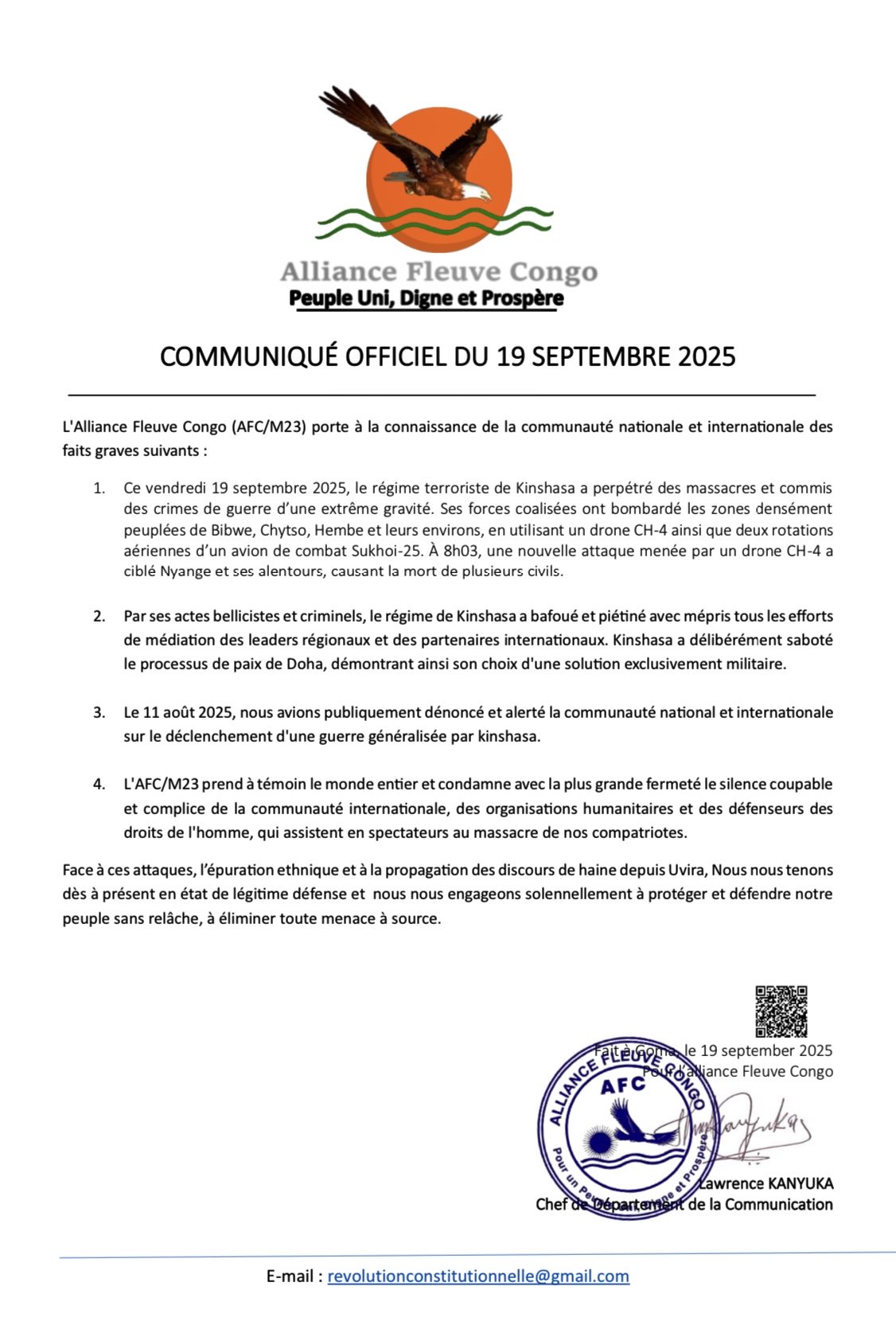 Iri tangazo ryashyizwe hanze n’Umuvugizi wa AFC/M23, Lawrence Kanyuka kuri uyu wa Gatanu tariki 19 Nzeri 2025, rigaragaza intego ya AFC/M23 yo kumenyesha Abanyekongo bose n’umuryango mpuzamahanga, aho rigira riti: “Kuva saa moya zo muri iki gitondo tariki 19 Nzeri 2025, abarwanyi b’ubutegetsi bw’iterabwoba bwa Kinshasa, barashe bikomeye mu bice bituwemo n’abaturage bya Bibwe, Nyenge, Chytso, Hembe no mu bindi bihakikije.”