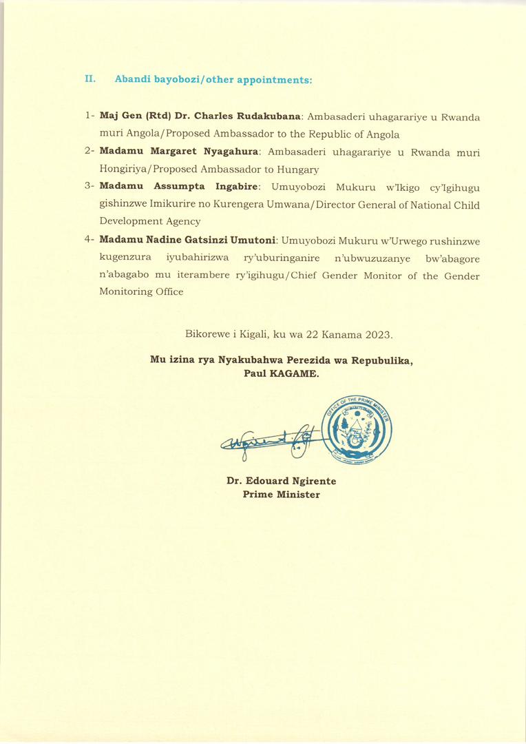 Madamu Claudette Irere yagizwe Umunyamabanga wa Leta muri Minisiteri y’Uburezi, MINEDUC. Dr. Claudine Uwera yagizwe Umunyamabanga wa Leta muri Minisiteri y’Ibidukikije.