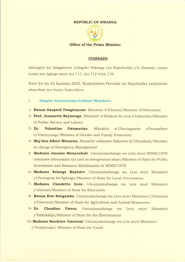 Ashingiye ku biteganywa n’Itegekonshinga, Perezida wa Repubulika y’u Rwanda Paul Kagame yakoze impinduka muri Guverinoma aho Gaspard Twagirayezu yagizwe Minisitiri w’Uburezi asimbuye Dr. Uwamariya Valentine wagizwe Minisitiri w’Uburinganire n’Iterambere ry’Umuryango.
