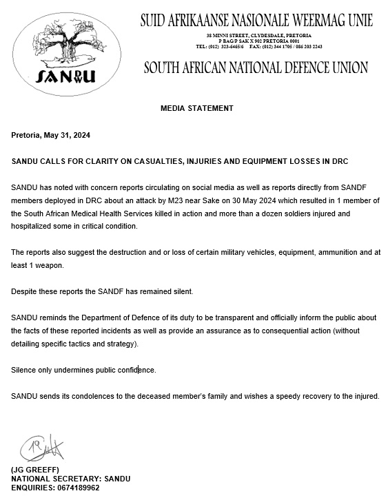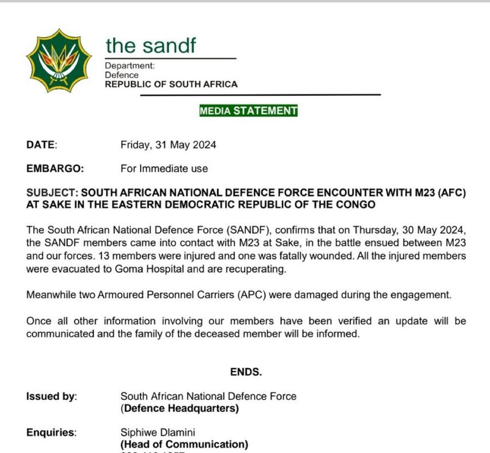 Kuwa Gatanu tariki 31 Gicurasi 2024, Igisirikare cya Afurika y’Epfo cyatangaje ko umusirikare wabo wari mu butumwa bwa SADC muri DR Congo yishwe n’ibisasu bya M23, abasaga 13 barakomereka, mu gihe ngo imodoka zabo ebyiri zitamenwa n’amasasu nazo zangijwe n’ibisasu by’abarwanyi b’uyu mutwe. Ku ruhande rwa M23 bo batangaje ko bafashe izo modoka, bakaba baranazijyane mu duce bagenzura ndetse ngo bakaba baranafashe mpiri abasirikare ba Afurika y’Epfo, bica n’abandi, ibyatumye amwe mu mashyirahamwe yigenga muri Afurika y’Epfo yamagana Leta yabo kuko ngo amakuru itangaza ashobora kuba arimo ibinyoma.