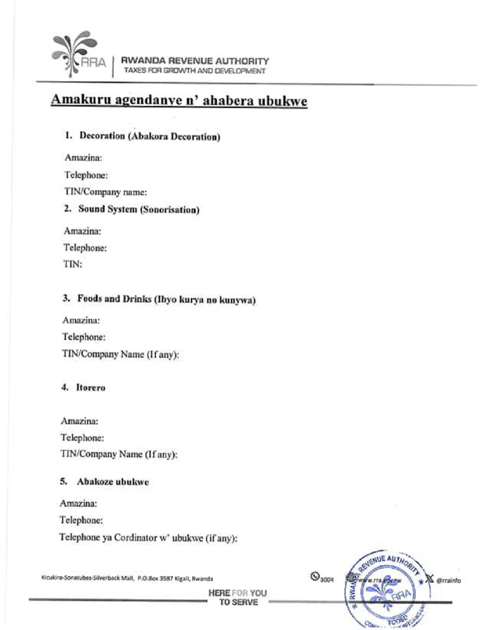 Iyo nyandiko ya RRA yahererekanyijwe cyane ku mbuga nkoranyambaga igaragaza ahagomba gushyirwa amakuru ajyanye n’umuntu wahawe akazi ko gutaka, abahawe akazi ko gutunganya ibyuma by’itumanaho, abahawe akazi ko gutanga ibyo kurya n’ibyo kunywa, Itorero ryasusurukije abantu ndetse n’amazina y’abageni.