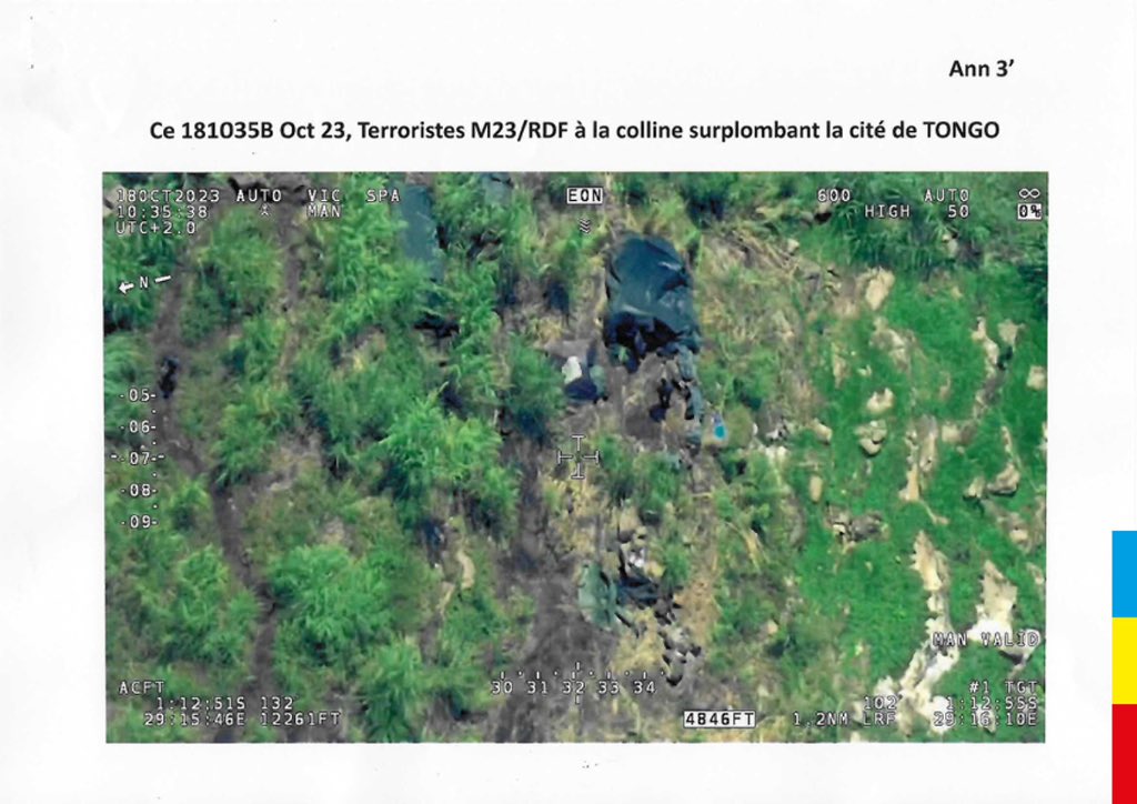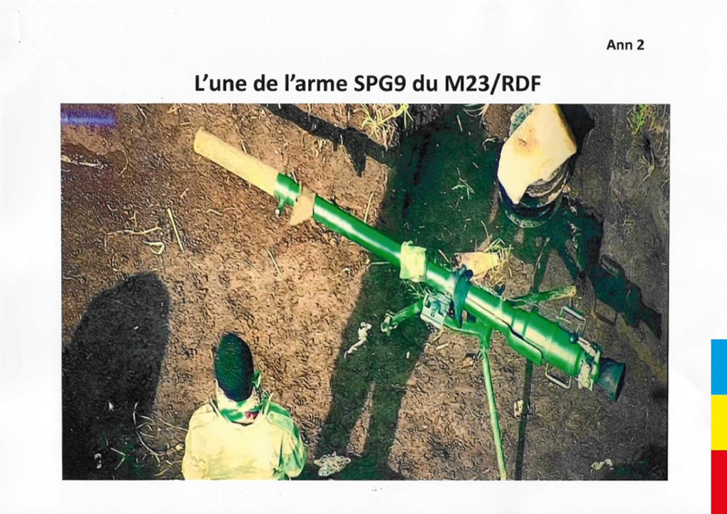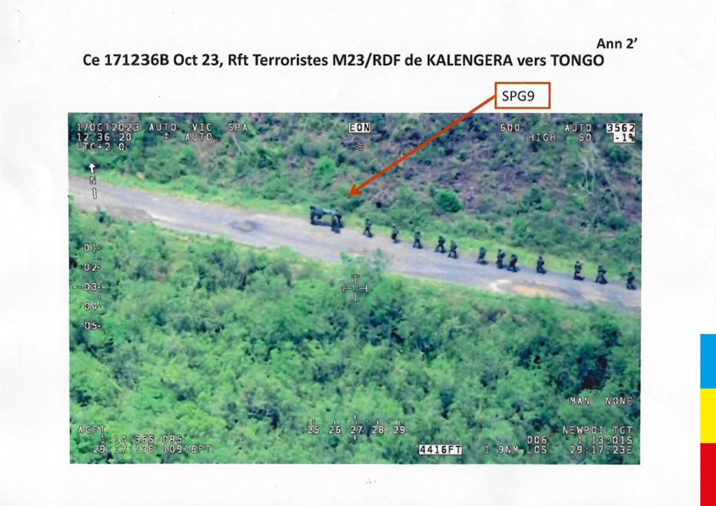 Ayo mafoto agaragaza abantu bari kugenda ku mirongo, ntagaragaza amasura yabo kuko afatiye kure, ndetse hari n’aho yerekana bamwe bateruye ikintu, ariko mu kuyasobanura DR Congo ivuga ko icyo bafite ari imbunda ya SPG-9. Ikomeza ivuga ko bari mu muhanda uva Tongo werekeza Kalengera.