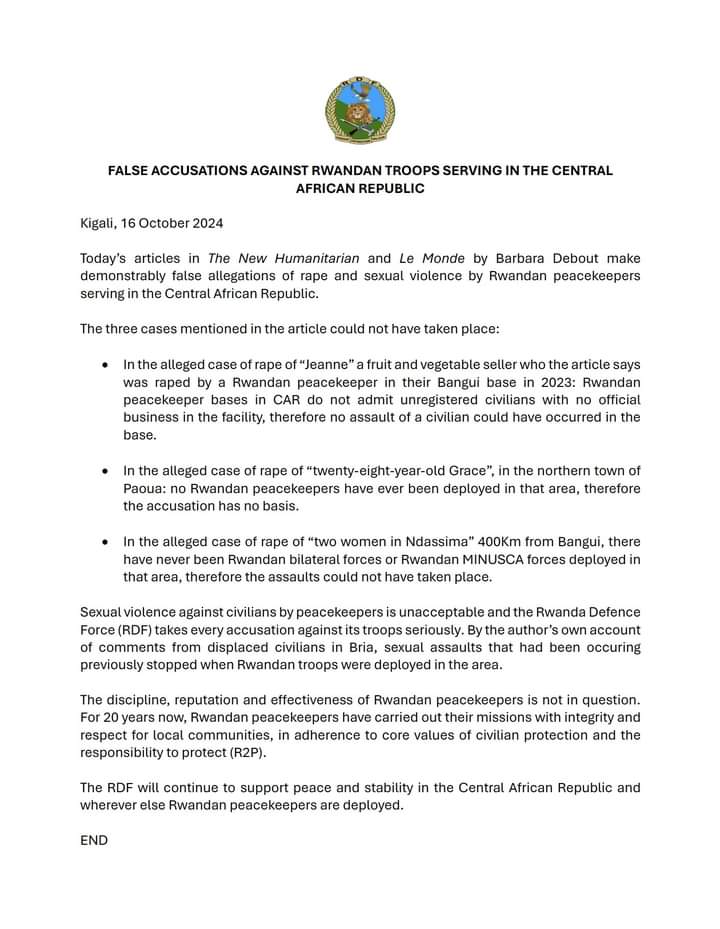 Igisirikare cy’u Rwanda (RDF) cyanyomoje amakuru yasohotse mu bitangazamakuru birimo The New Humanitarian na Le Monde, yashinjaga ingabo z’u Rwanda ziri mu butumwa bw’amahoro muri Centrafrique ibikorwa birimo gufata ku ngufu n’ihohotera rishingiye ku gitsina, kivuga ko ari ibinyoma bidafite ishingiro.