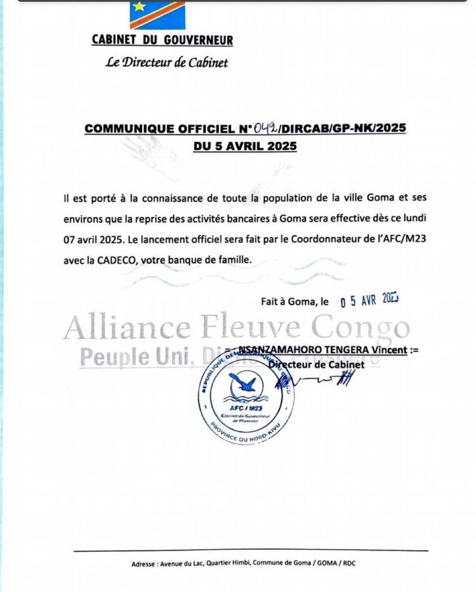 Itangazo ryashyizwe ahagaragara n’ubuyobozi bushinzwe imari muri Kivu kuri uyu wa Gatandatu tariki 05 Mata 2025, rigaragaza ko kuva kuwa Mbere tariki 07 Mata 2025, AFC/M23 izatangiza ku mugaragaro uburyo bwo kubitsa no kubikuza hagati y’abaturage bari mu bice byose bigenzurwa n’iri huriro ryiyemeje kurwanya ubutegetsi bwa Repubulika ya Demokarasi ya Congo.