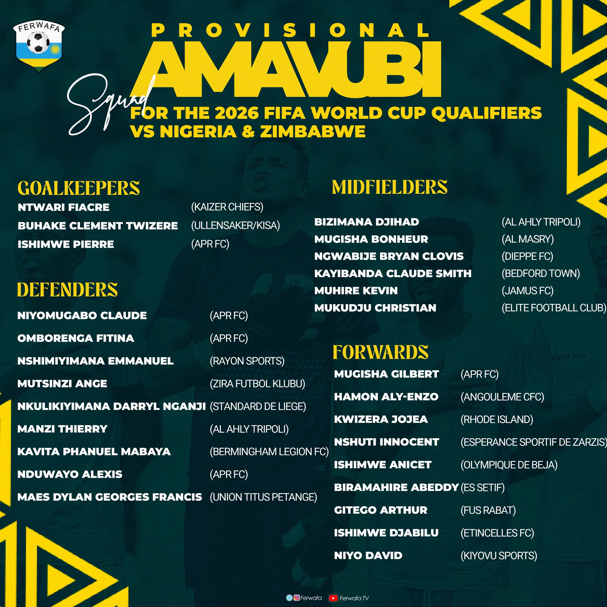 Ikipe y’Igihugu y’u Rwanda ‘Amavubi’ itozawa n’umutoza Adel Amrouche, yitegura guhura na Nigeria ndetse na Zimbabwe mu mikino yo gushaka itike y’Igikombe cy’Isi, yahamagaye abakinnyi 30 izifashisha batagaragayemoNigena Clément na Ruboneka Jean Bosco.