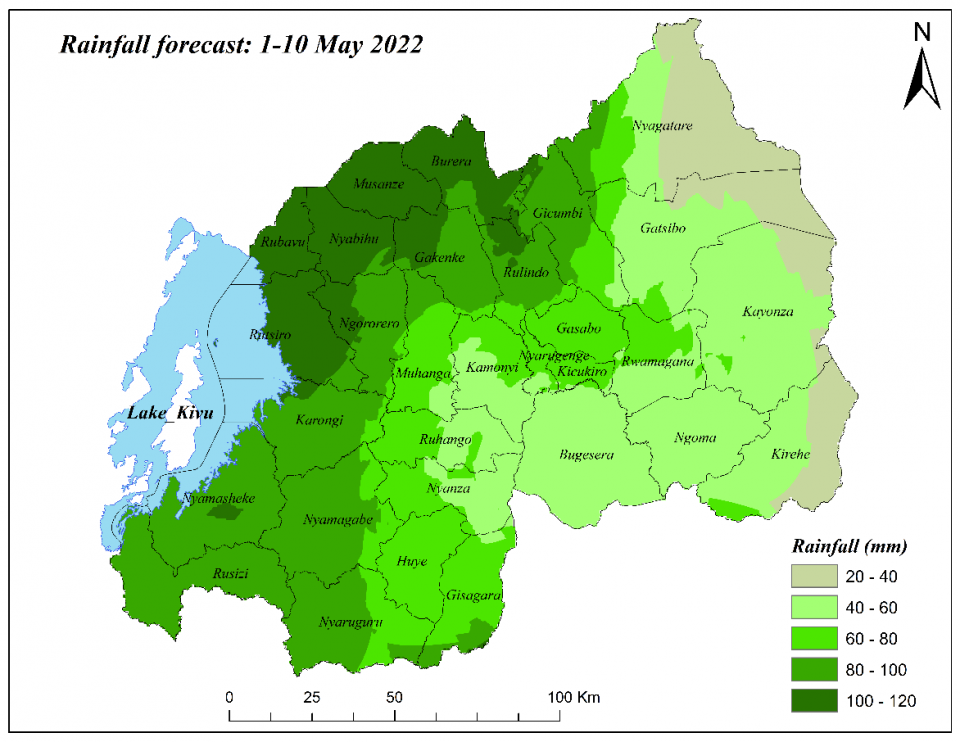 Kuri uyu wa Gatandatu tariki 30 Mata 2022, Metéo Rwanda, yatangaje ko mu gice cya mbere cy’ukwezi kwa gatanu (kuva taliki 01 kugeza taliki 10), mu Rwanda hateganyijwe imvura iri hagati ya milimetero 20 na 120, ibi bikaba bivuze ko ingano y’imvura iteganyijwe muri iki gice izagabanuka ugereranyije n’iyabonetse mu gice cya gatatu cya Mata 2022.
