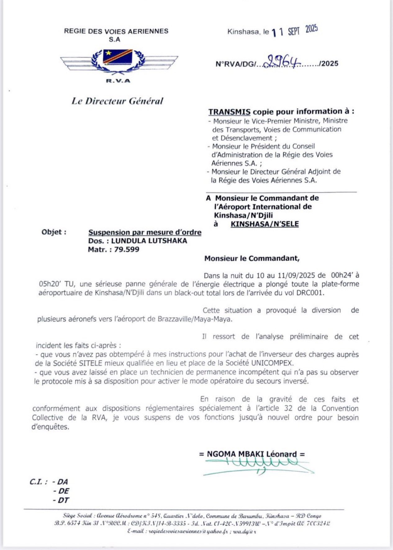 Kubera iyo mpamvu, hakurikijwe kandi ingingo ya 32 y’amasezerano rusange ya RVA, umuyobozi w’Ikibuga cy’indege cya N’Djili uzwi ku izina rya Lundula Lutshaka, yahagaritswe “kugeza igihe azamenyeshwa” mu gihe hagikorwa iperereza ryimbitse.