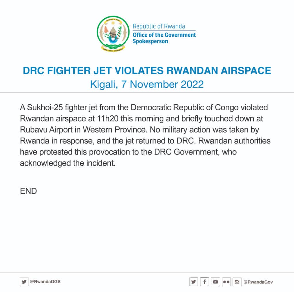 Mu itangazo yashyize ahagaragara, Leta y’u Rwanda yamaganye ubushotoranyi bukomeje gukorwa na DR Congo kugeza ubwo indege ya gisirikare yinjira ku butaka bw’u Rwanda ndetse ikagwa no ku Kibuga cy’Indege cya Gisenyi, kuri uyu wa Mbere tariki 07 Ugushyingo 2022, ahagana saa tanu na makumyabiri (11h20).