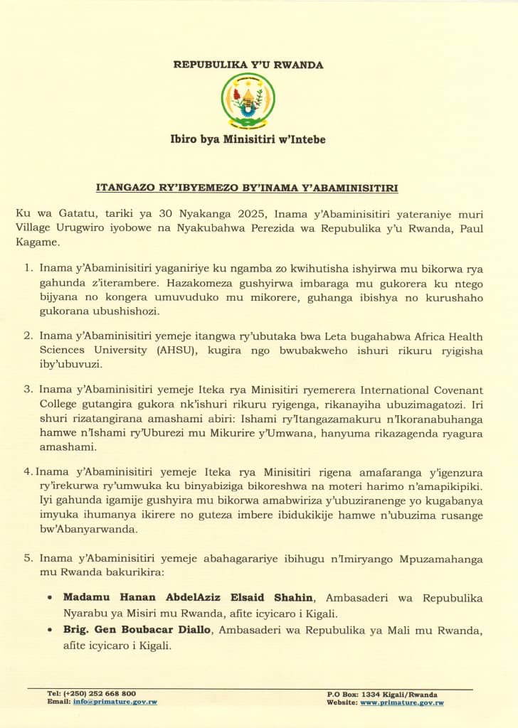 Inama y’Abaminisitiri yateranye kuri uyu wa Gatatu tariki 30 Nyakanga 2025, yafatiwemo ibyemezo bitandukanye birimo kwemerera Ishuri Rikuru Mpuzamahanga rya International Covenant College gukorera mu Rwanda nk’ishuri ryigenga.