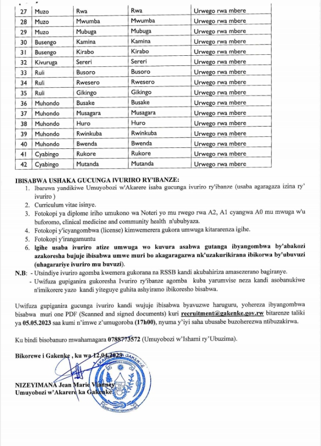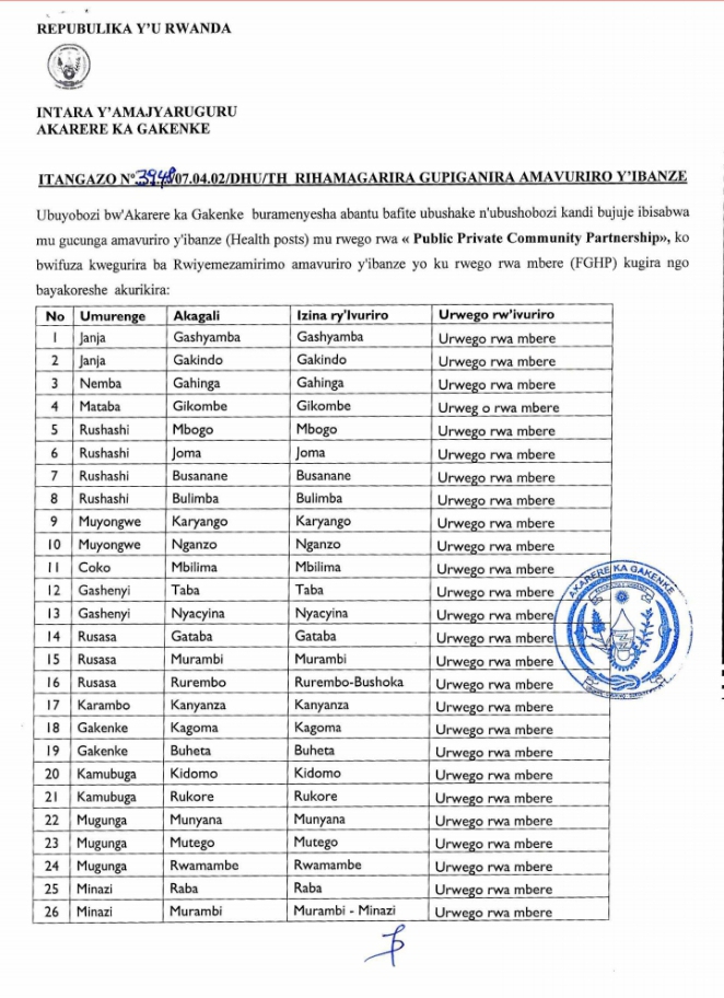 Ubuyobozi bw’Akarere ka Gakenke gaherereye mu Ntara y’Amajyaruguru, buramenyesha abantu bose babifitiye ubushake n’ubushobozi kandi bujuje ibyangombwa mu gucunga amavuriro y’ibanze (Health Posts) mu rwego rwa “Pubic Private Community Parternership”, ko bwifuza kwegurira ba rwiyemezamirimo amavuriro y’ibanze yo ku rwego rwa mbere kugirango bayakoreshe.