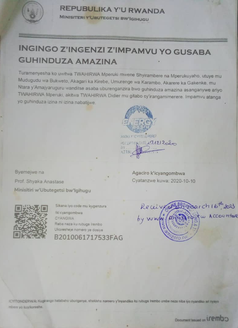 Uwitwa Twahirwa Mperuki, mwene Shyirambere na Mperukuyaho, utuye mu Mudugudu wa Bukweto, Akagari ka Kirebe, Umurenge wa Karambo, Akarere ka Gakenke, Intara y’Amajyaruguru; arasaba uburenganzira bwo guhinduza amazina asanganywe ari yo Twahirwa Mperuki, akitwa Twahirwa Didier mu gitabo cy’irangamimerere.