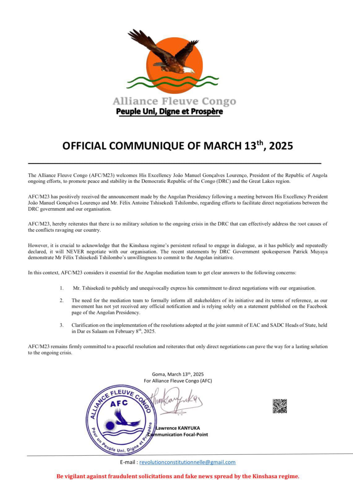 Kubera izi mpamvu rero, AFC/M23 yasohoye itangazo isaba Kinshasa ko ikwiye gukuraho urujijo, Perezida Tshisekedi we ubwe agatangaza ko yemeye ibiganiro ndetse hagashyirwaho uburyo busobanutse ibi biganiro bizanyuzwamo kuko ngo bo kuva cyera bahoze bifuza ibiganiro ariko bikaburizwamo na Leta ya Kinshasa.
