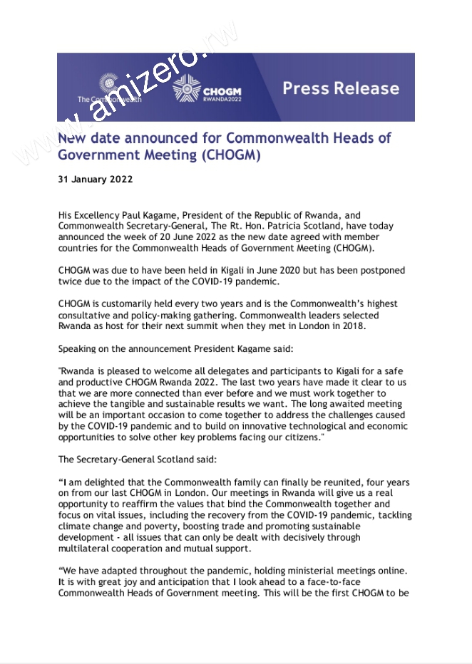Ubunyamabanga bw’Umuryango w’Ibihugu bikoresha Icyongereza (Commonwealth), bubinyujije mu itangazo, buvuga ko Perezida w’u Rwanda, Paul Kagame n’Umunyamabanga Mukuru wa Commonwealth, Patricia Scotland, batangaje itariki nshya y’inama y’abakuru b’Ibihugu na Guverinoma, CHOGM.