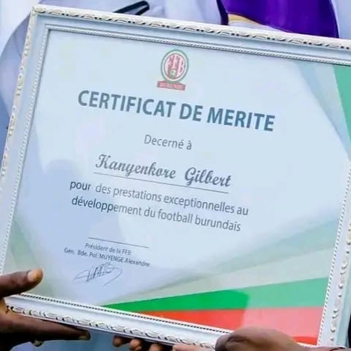 Perezida wa FFB, Muyenge Alexander, yamuteye inkunga ya miliyoni 8 z’Amarundi (arenga miliyoni 4 mu mafaranga y’u Rwanda) anamuha icyemezo cy’ishimwe kubera umusanzu we mu iterambere ry’umupira w’amaguru.
