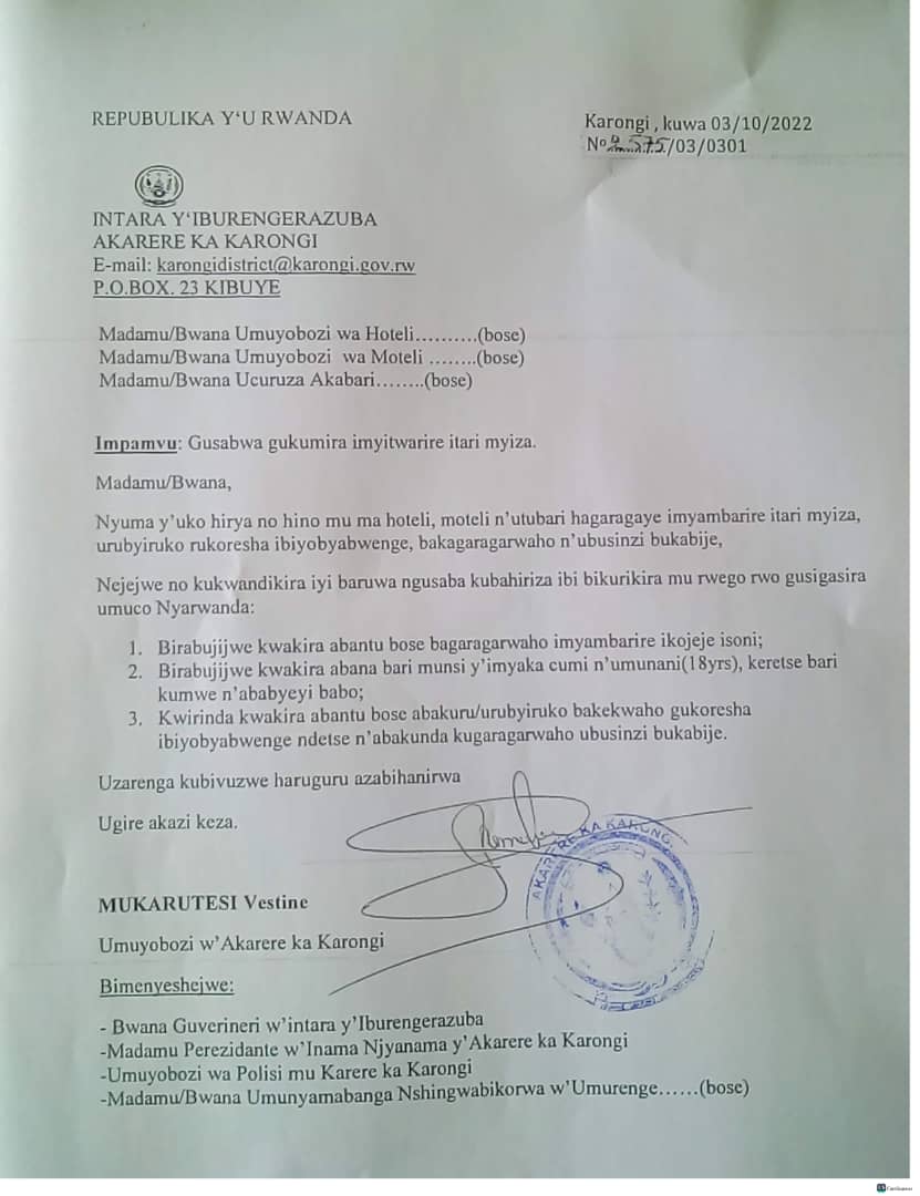 Iri tangazo rigira riti: “Birabujijwe kwakira abantu abo ari bo bose bagaragayeho imyambarire iteye isoni, kwakira abantu bose abakuru cyangwa urubyiruko bakekwaho gukoresha ibiyobyabwenge ndetse n’abakunda kugaragarwaho ubusinzi bukabije kandi ntibyemewe kwakira abana bari munsi y’imyaka 18 keretse igihe bari kumwe n’ababyeyi babo”.