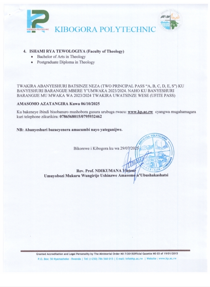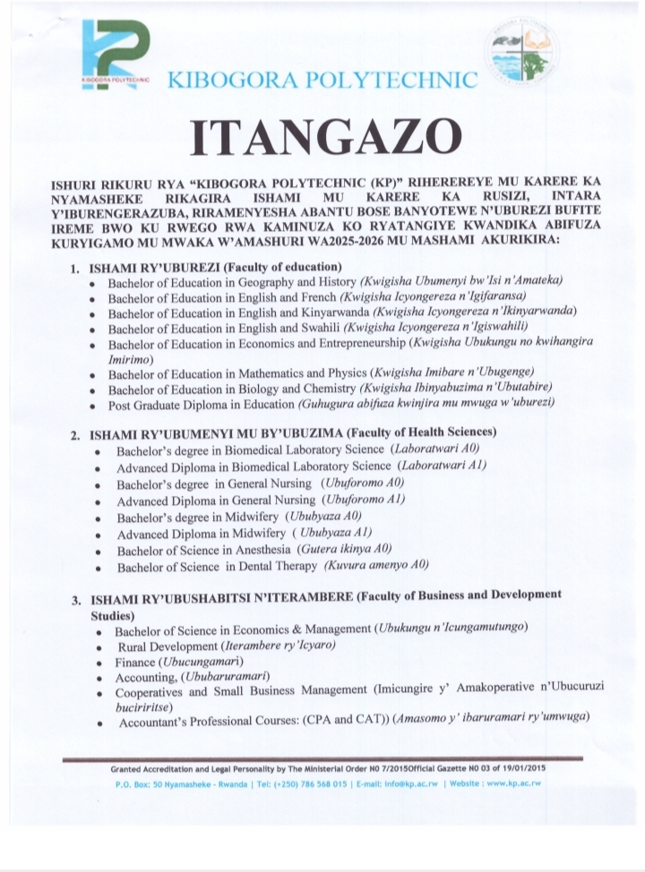 Ubuyobozi bw’Ishuri Rikuru rya “Kibogora Polytechnic (KP) riherereye mu karere ka Nyamasheke rikagira Ishami mu karere ka Rusizi, Intara y’Iburengerazuba buramenyesha abantu bose banyotewe n’uburezi bufite ireme kandi butanga ibisubizo ku bibazo bigaragara ku isoko ry’umurimo ko batangiye kwandika abifuza kwiga muri iyi Kaminuza mu mwaka w’amashuri 2025-2026.