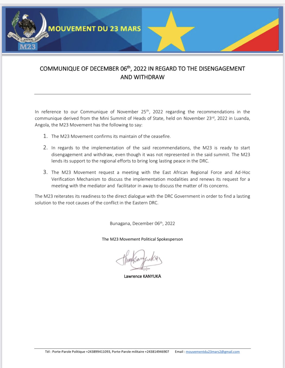 Ibi byemezo bishya bya M23 bikubiye mu itangazo uyu mutwe washyize ahagaragara kuri uyu wa Kabiri, tariki 06 Ukuboza 2022, mu gihe ukomeje gushyirwaho igitutu nyuma y’imirwano yabereye i Kishishe tariki 29 Ugushyingo 2022, hakabamo ubwicanyi bw’abasivile Leta ya Congo yashyize ku mutwe wa M23, bwatumye mu Gihugu hose hashyirwaho icyunamo cy’iminsi itatu cyarangiye kuwa mbere w’iki Cyumweru.