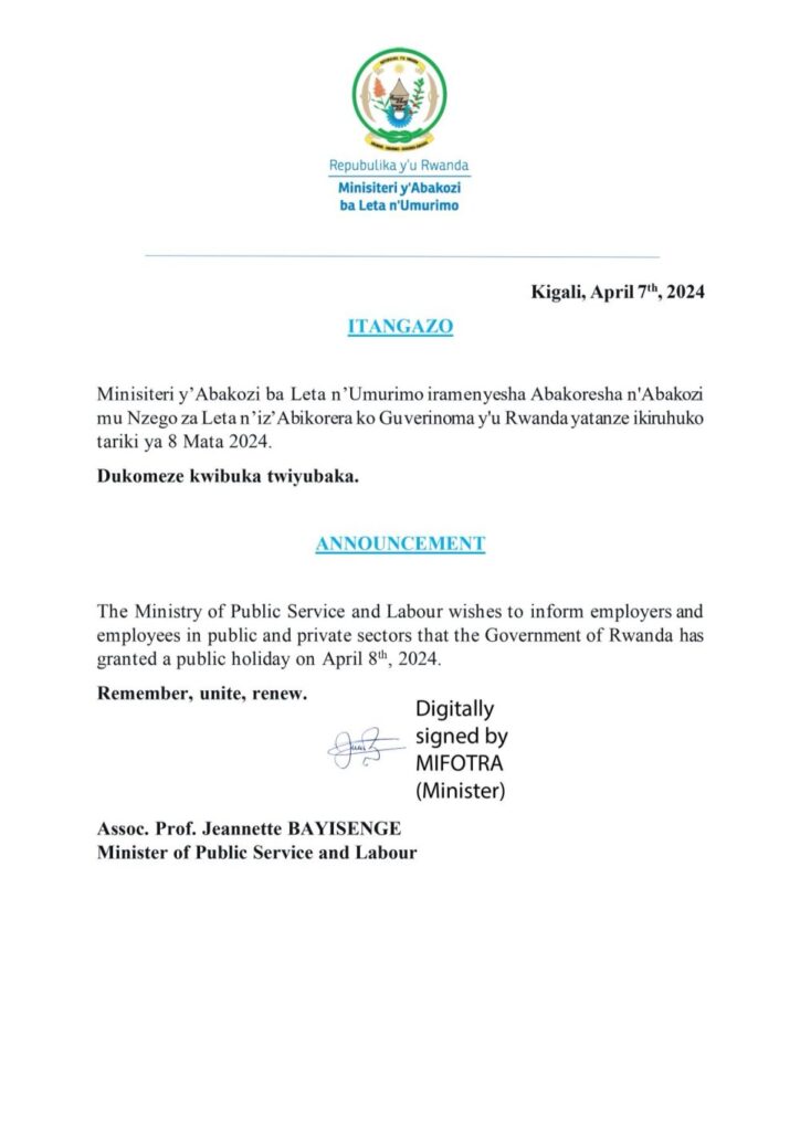 Minisitiri w’Abakozi ba Leta n’Umurimo mu Rwanda, Assoc. Prof Jeannette Bayisenge yamenyesheje abakozi b’inzego za Leta n’izabikorera, ko kuri uyu wa Mbere tariki 08 Mata 2024 ari umunsi w’ikiruhuko.