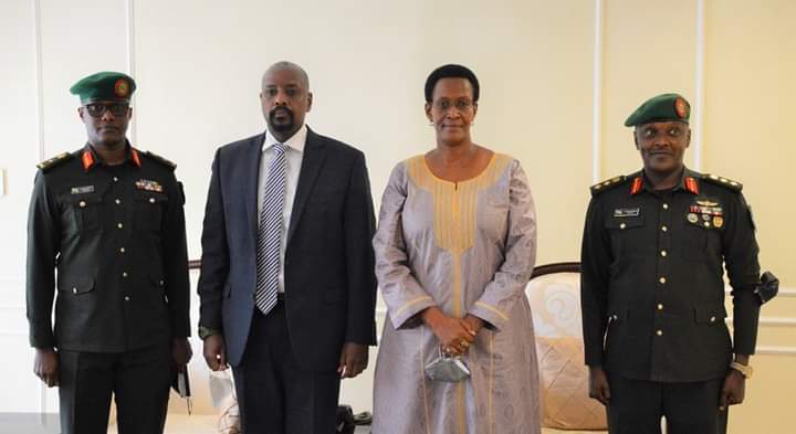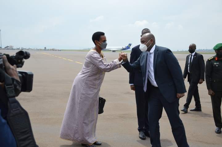 Akigera ku Kibuga Mpuzamahanga cy’Indege cya Kigali i Kanombe, Kainerugaba yakiriwe na Chargé d’Affaires wa Ambasade ya Uganda i Kigali, Anne Katusiime, Brigadier General Willy Rwagasana ukuriye abashinzwe umutekano w’abayobozi bakuru b’Igihugu n’umuvugizi w’Igisirikare cy’u Rwanda, RDF, Col Ronald Rwivanga.