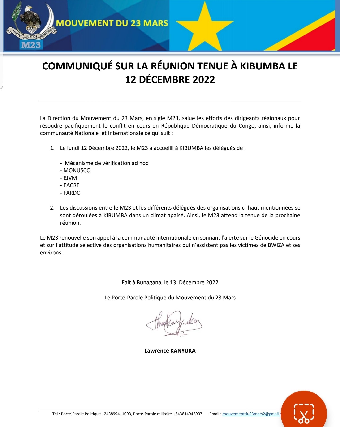 Itangazo ryashyizwe ahagaragara na M23, rivuga ko uyu mutwe wishimira imbaraga zikomeje gushyirwa mu gukemura ibibazo biri muri Repubulika Iharanira Demokarasi ya Congo, rigakomeza rivuga ko M23 ku wa Mbere w’iki Cyumweru tariki 12 Ukuboza 2022, yakiriye itsinda ry’intumwa za MONUSCO, EJVM, EACRF, FARDC mu rwego rwo kuganira ku bikomeje gutuma barwana.