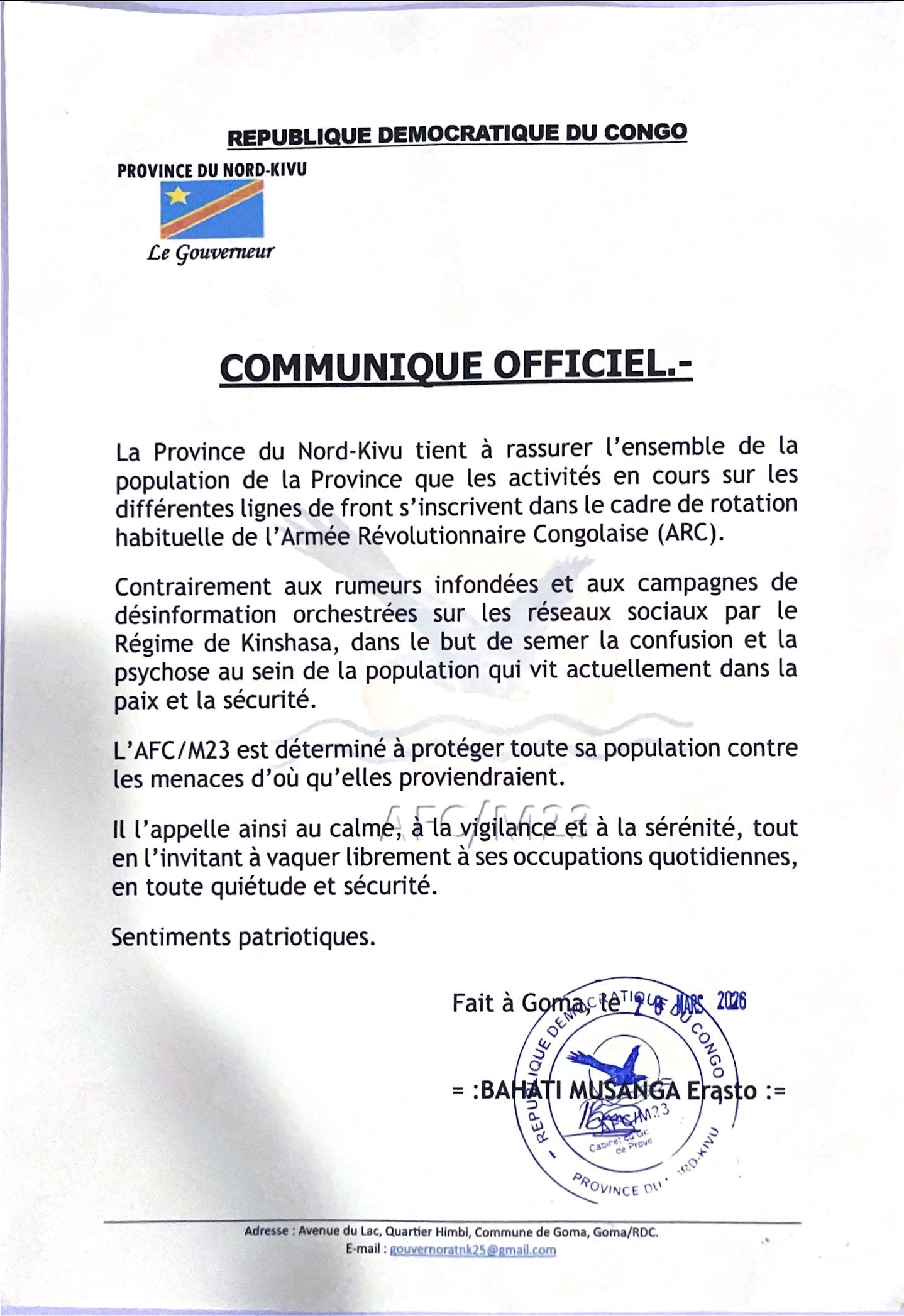 Ubutumwa umuvugizi wa M23 Lawrence Kanyuka yatangaje ku rubuga nkoranyambaga X mu ijoro ryo ku wa gatandatu tariki 28 Werurwe 2026 bugira buti: “Ibikorwa birimo kugaragara muri iki gihe ku mirongo inyuranye yo ku rugamba bijyanye gusa n’ihinduranya risanzwe kandi ry’amayeri y’urugamba ry’imitwe y’ingabo ya M23.”