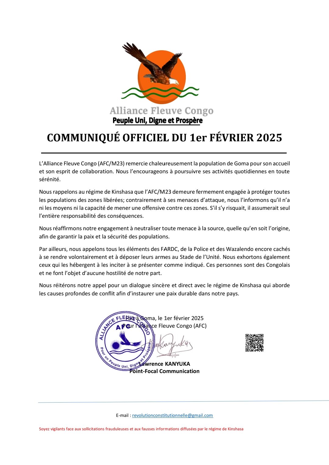 Muri iri tangazo ryasohotse ku mugoroba wo kuri uyu wa Gatandatu tariki 01 Gashyantare 2025, AFC/M23 yibutsa ko igikomeye ku mugambi wayo w’ibiganiro by’imbonankubone bizira imbereka hagati yayo na Leta ya Kinshasa bisubiza byimbitse impamvu muzi z’iyi ntambara kugira ngo amahoro arambye aboneke.