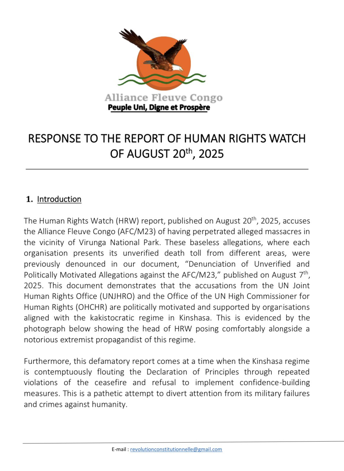 M23 ivuga ko isanzwe yarahakanye ibi birego bidafite ishingiro mu nyandiko yayo yo ku itariki ya 07 Kanama 2025. M23 ivuga ko buri muryango, HRW na ONU utanga umubare w’abapfuye mu duce dutandukanye nyamara batarahageze ahubwo ari amakuru y’ibinyoma.