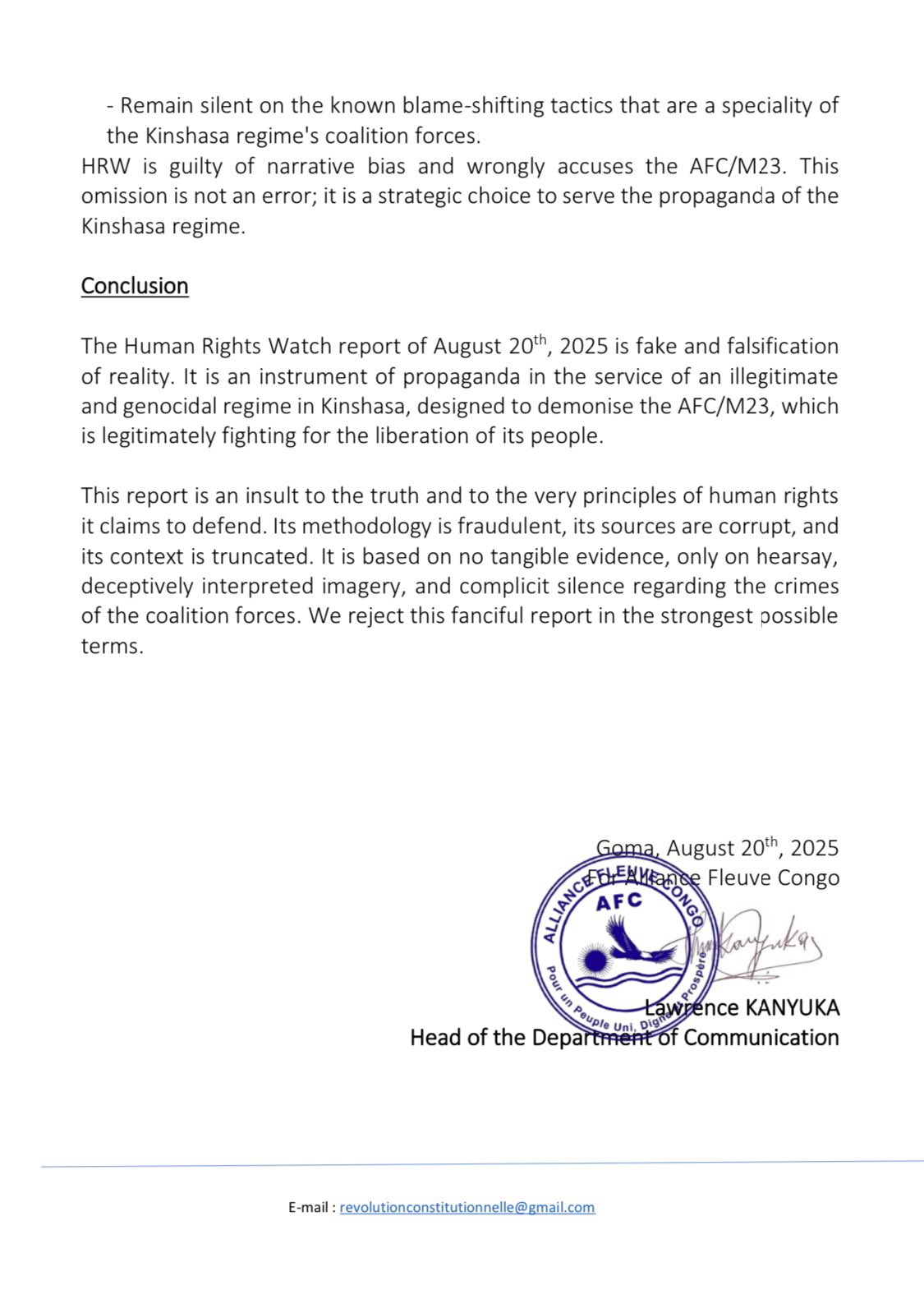 Abarwanyi ba AFC/M23 barwanya ubutegetsi bwa Repubulika ya Demokarasi ya Congo bavuga ko raporo nshya y’umuryango uharanira uburenganzira bwa muntu Human Rights Watch (HRW) ibashinja gukora itsembatsemba ku basivile biganjemo Abahutu mu burasirazuba bwa DR Congo, ari ikinyoma kandi ko nta shingiro ifite.