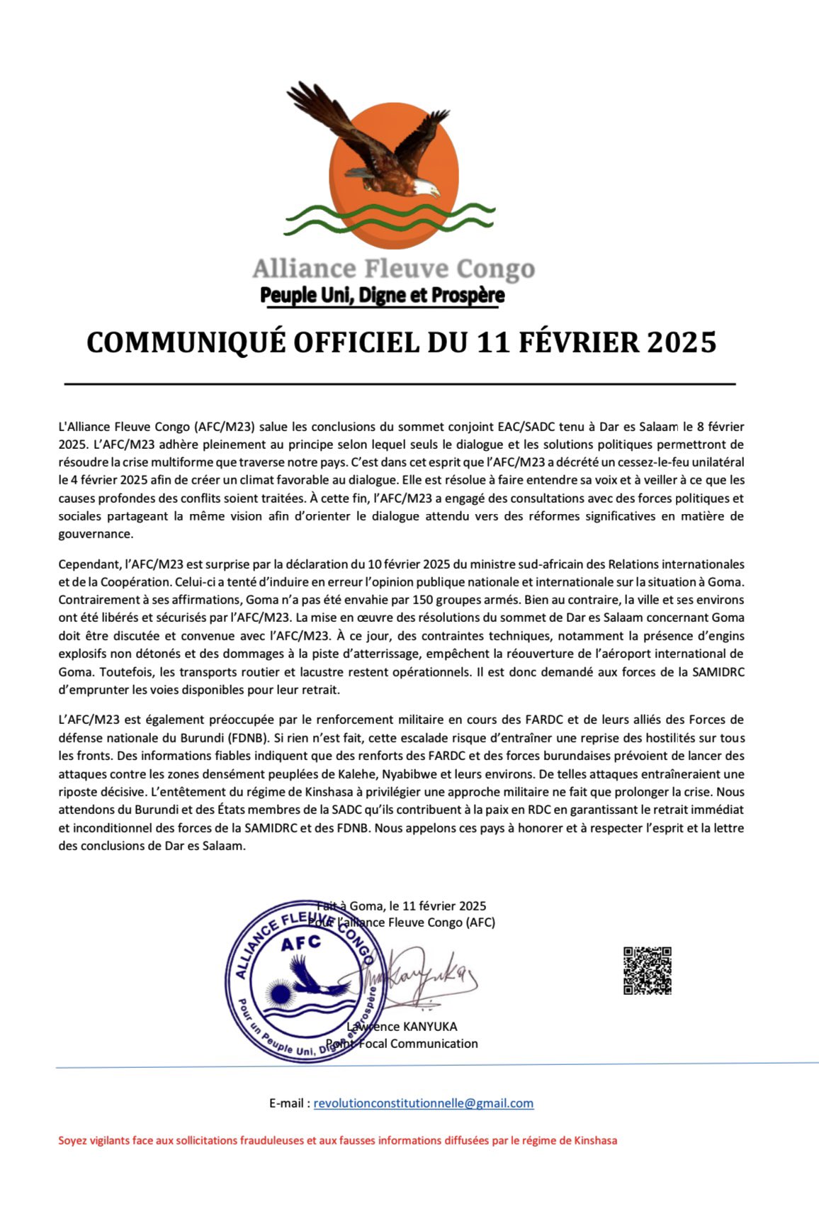 Itangazo rya AFC/M23 ryibutsa ingabo za SADC (Tanzania, Afurika y’Epfo na Malawi) ndetse wongeyeho n’iz’u Burundi kuzinga utwangushye zikava ku butaka bwa Repubulika Iharanira Demokarasi ya Congo kuko ngo nta gakondo bahafite.