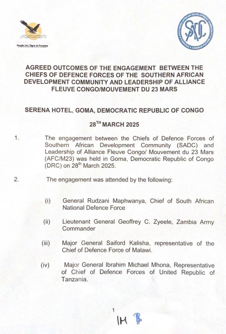 Ibi ni ibyavuye mu nama idasanzwe yahuje abagaba b’ingabo za Afurika y’Epfo, Tanzania na Malawi hamwe na General Major Emmanuel Sultan Makenga uyobora ibikorwa bya gisirikare muri AFC/M23 akaba n’umugaba mukuru wa ARC kuri uyu wa Gatanu tariki 28 Werurwe 2025 i Goma mu ntara ya Kivu y’Amajyaruguru.