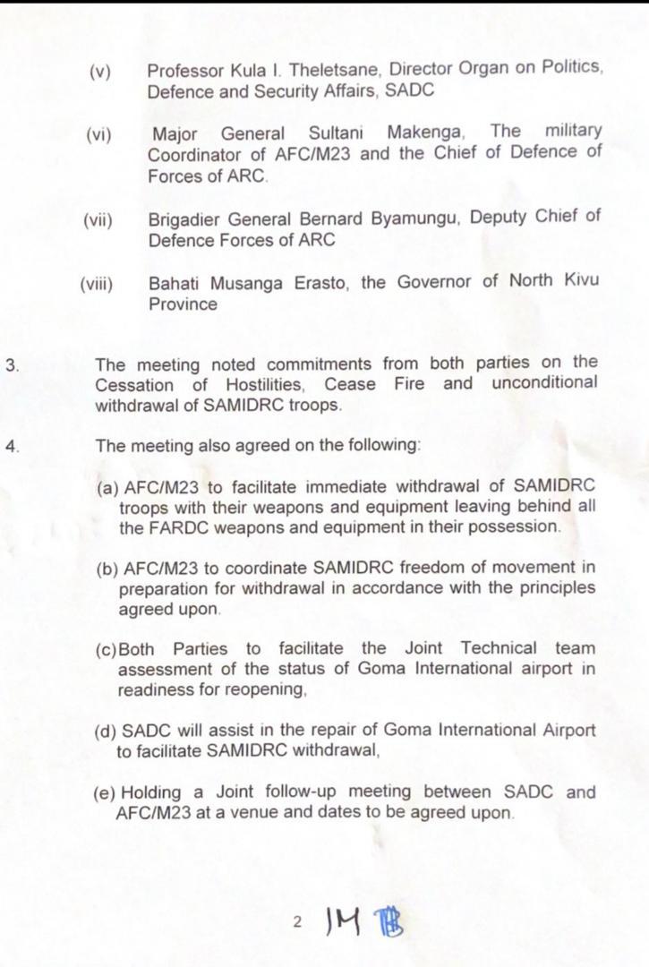 Muri iyi mishyikirano, impande zombi zumvikanye ko AFC/M23 igiye gufasha ingabo za SADC (Afurika y’Epfo Tanzania na Malawi) kwitegura gusubira mu bihugu zaturutsemo, kandi ibikorwa by’amakimbirane bari bafitanye bigahagarara.