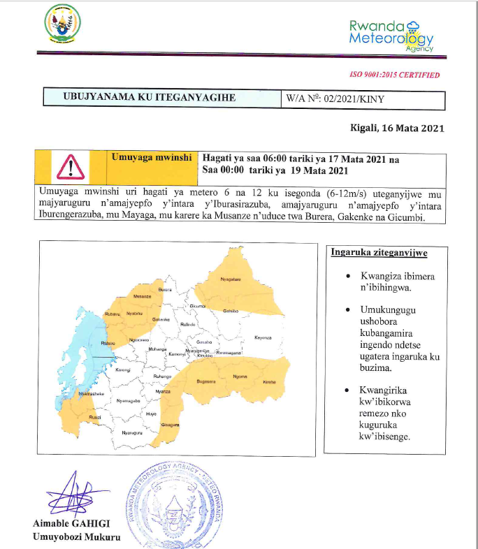 Ikigo cy’u Rwanda gishinzwe iteganyagihe-Rwanda Meteorology Agency cyaburiye abanyarwanda ko guhera kuri uyu wa Gatandatu tariki 17 Mata 2021 saa kumi n’ebyiri (06:00) kugera kuwa mbere tariki 19 Mata 2021 saa sita z’ijoro (00:00) hateganyijwe umuyaga mwinshi muri bimwe mu bice by’Igihugu, ukaba ushobora kwangiza byinshi.