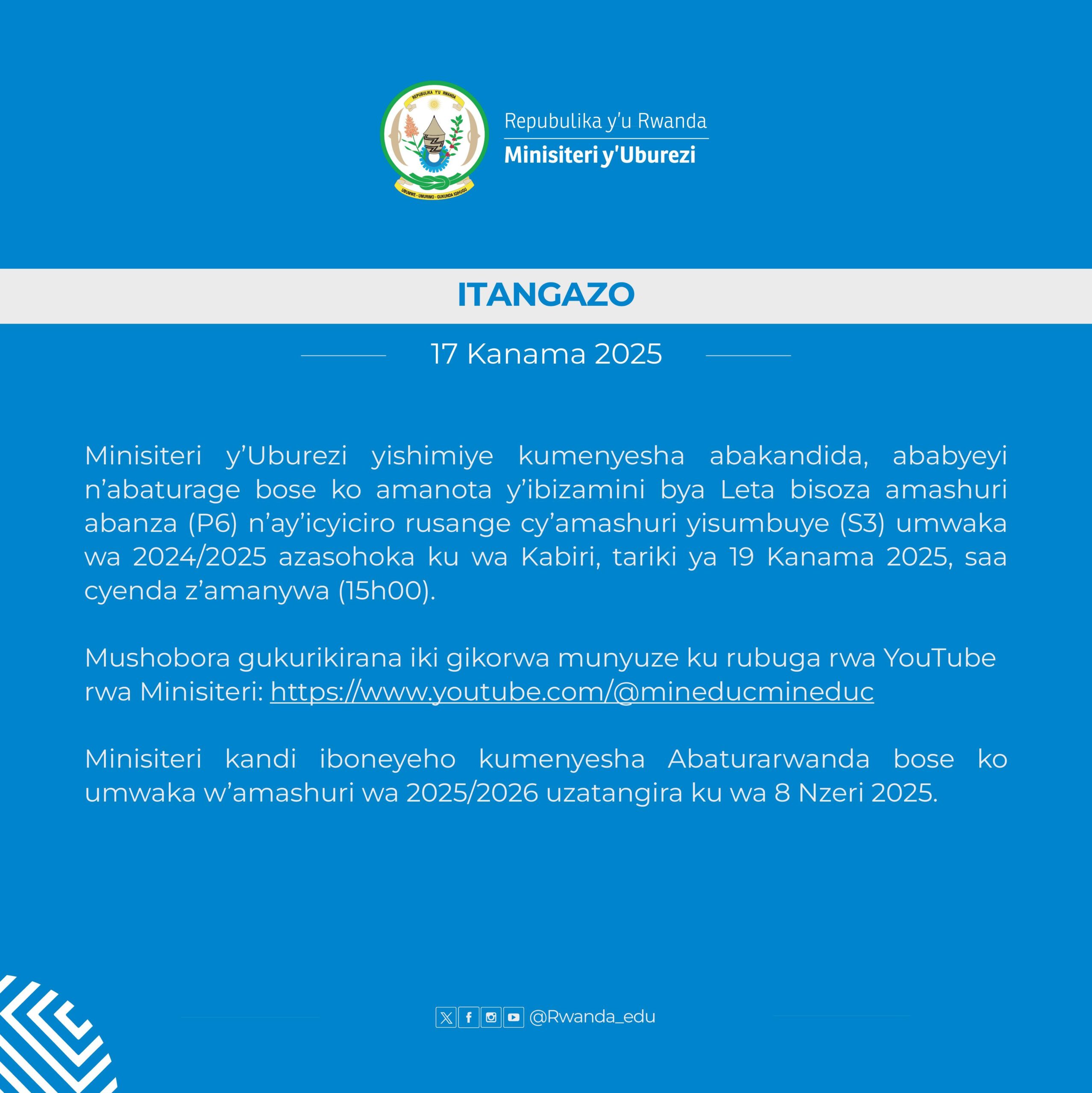 Minisiteri y’Uburezi mu Rwanda, MINEDUC yatangaje ko amanota y’ibizamini bisoza amashuri abanza (P6) n’ay’icyiciro rusange (S3) azatangazwa ku wa Kabiri tariki 19 Kanama 2025 Saa Cyenda z’amanywa, inatangaza itariki y’itangira ry’amashuri umwaka wa 2025/2026.