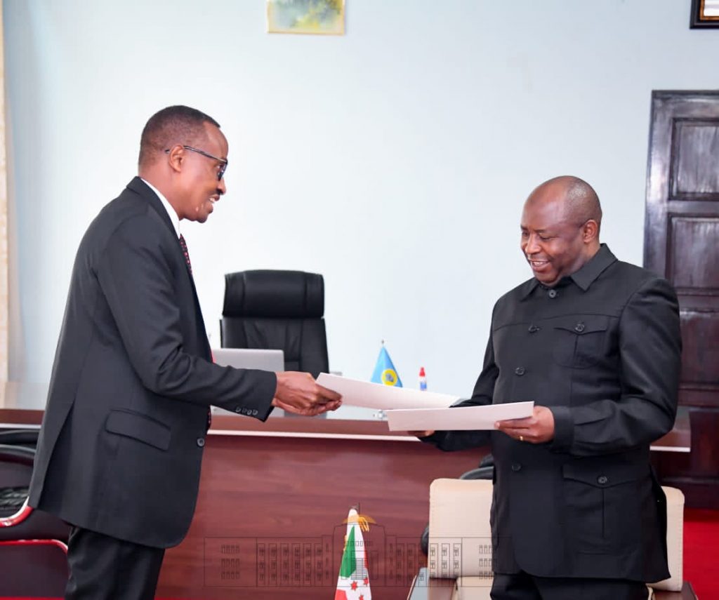 Ubutumwa bwa Perezida Kagame bwatwawe na Minisitiri w’Ingabo, Major General Albert Murasira, wabushyikirije Perezida Ndayishimiye mu biro bye i Gitega muri Ntare Rushatsi.