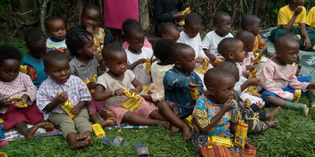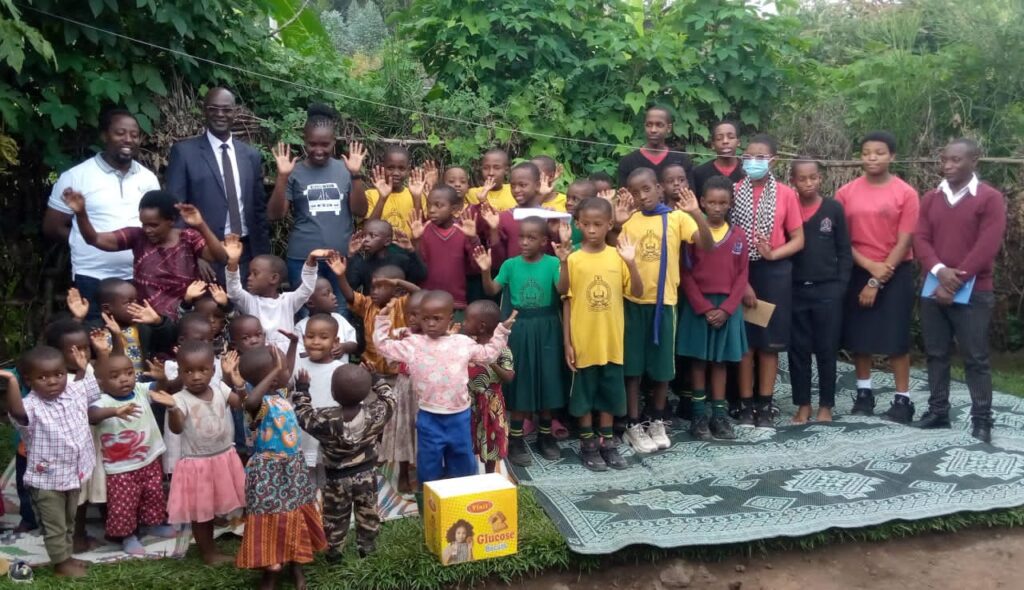 Bamwe mu bana barerwa na Nyiramafishi Rachel bahawe amata n’ibisuguti n’abo muri Wisdom Schools.