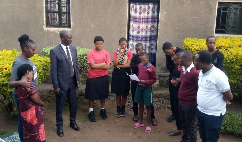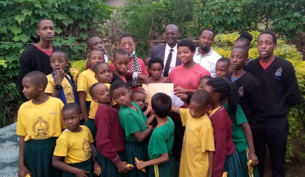 Bamwe mu banyeshuri ba Wisdom Schools bashyikiriza Nyiramafishi Rachel ibahasha irimo inkunga bamugeneye.