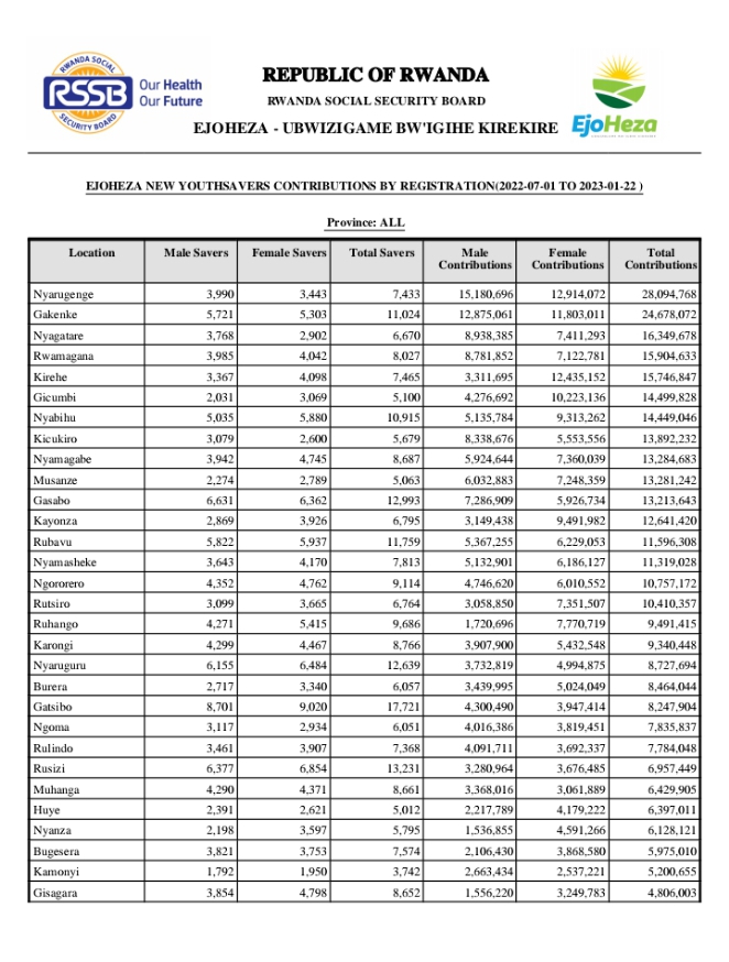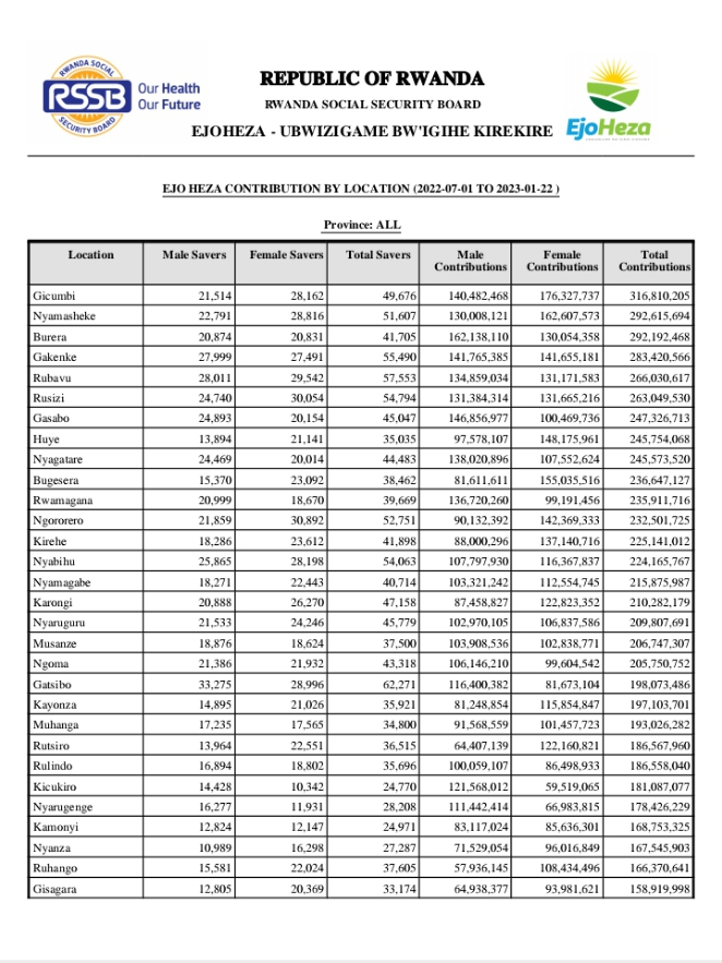 RSSB ifite mu nshingano gucunga imisanzu itangwa muri EjoHeza, yatangaje ko muri 2021/2022 Akarere ka Gakenke kesheje uwo muhigo ku kigero cya 171%, kaza ku mwanya wa mbere n’umusanzu ungana na miliyoni 642.3 Frw ku ntego ya miliyoni 375 Frw kari kihaye.