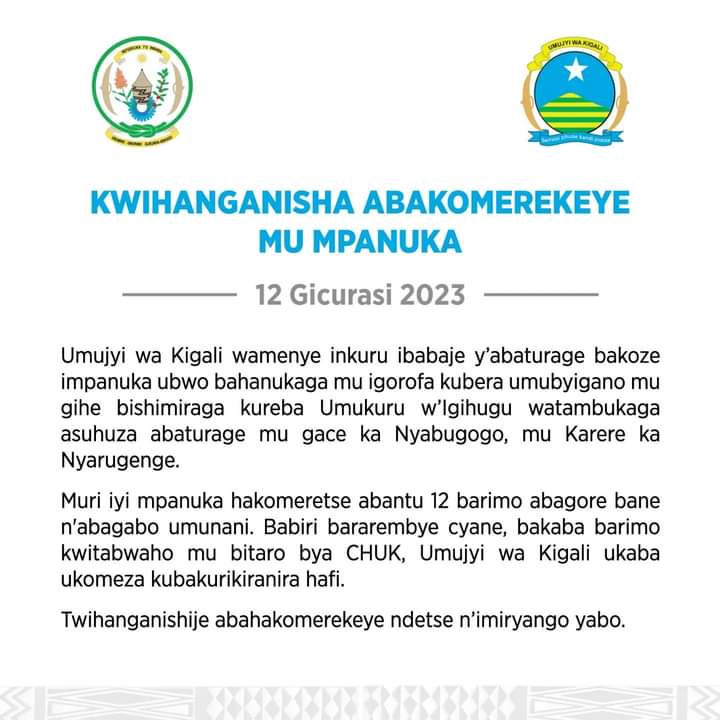 Ubuyobozi bw’Umujyi wa Kigali bwatangaje ko abantu byibuze 12 barimo abagore bane n’abagabo umunani bakomerekeye mu mpanuka yabaye ku mugoroba wo kuri uyu wa Gatanu, tariki 12 Gicurasi 2023, ubwo abantu benshi bahanutse mu igorofa iherereye i Nyabugogo mu Karere ka Nyarugenge, mu gihe babyiganaga bashaka kureba Umukuru w’Igihugu.