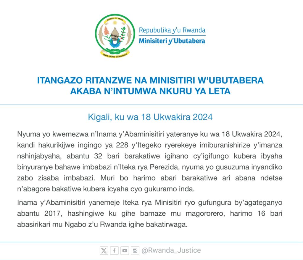 Ashingiye ku biteganywa n’Itegeko Nshinga rya Repubulika y’u Rwanda, Perezida wa Repubulika Nyakubahwa Paul Kagame yatanze imbabazi ku bagororwa barimo CG(Rtd) Gasana Emmanuel wabaye Umuyobozi Mukuru wa Polisi y’u Rwanda na Bamporiki Edouard wabaye Umunyamabanga wa Leta muri Minisiteri y’Urubyiruko.