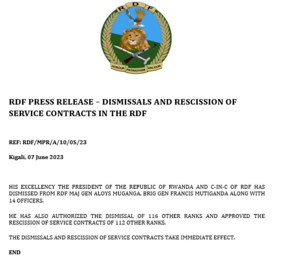 Perezida wa Repubulika y’u Rwanda Paul Kagame akaba n’umugaba w’Ikirenga w’Ingabo z’u Rwanda (RDF) yirukanye mu gisirikare abofisiye 16 mu ngabo barimo Maj Gen Aloys Muganga na Brig Gen Francis Mutiganda.